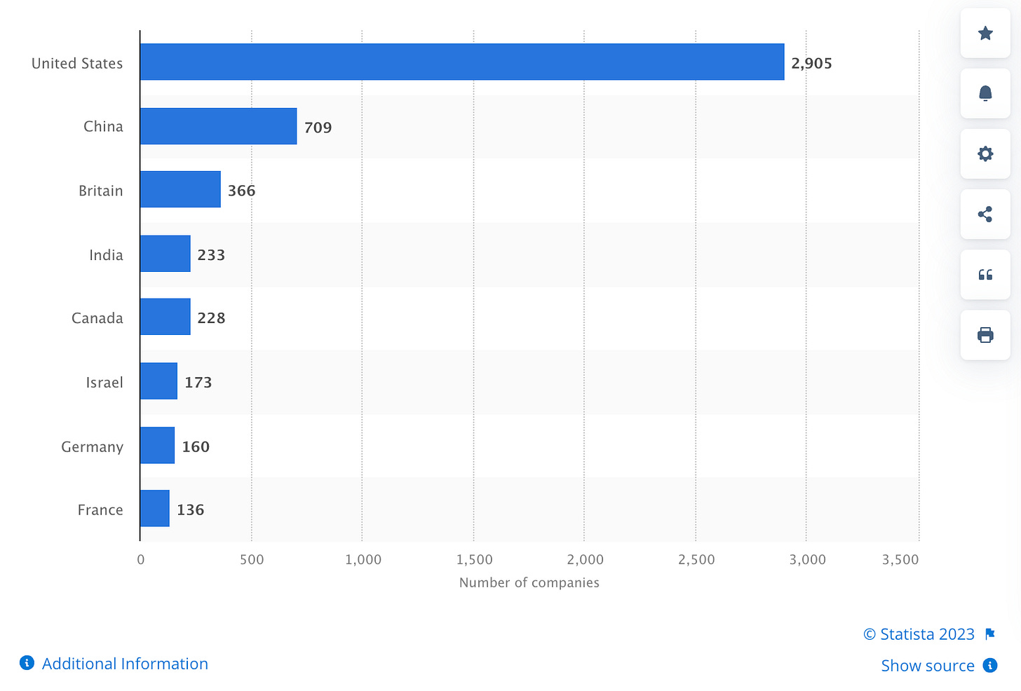 Although slightly dated, the chart below also illustrates that the bulk of AI companies are based in the United States: