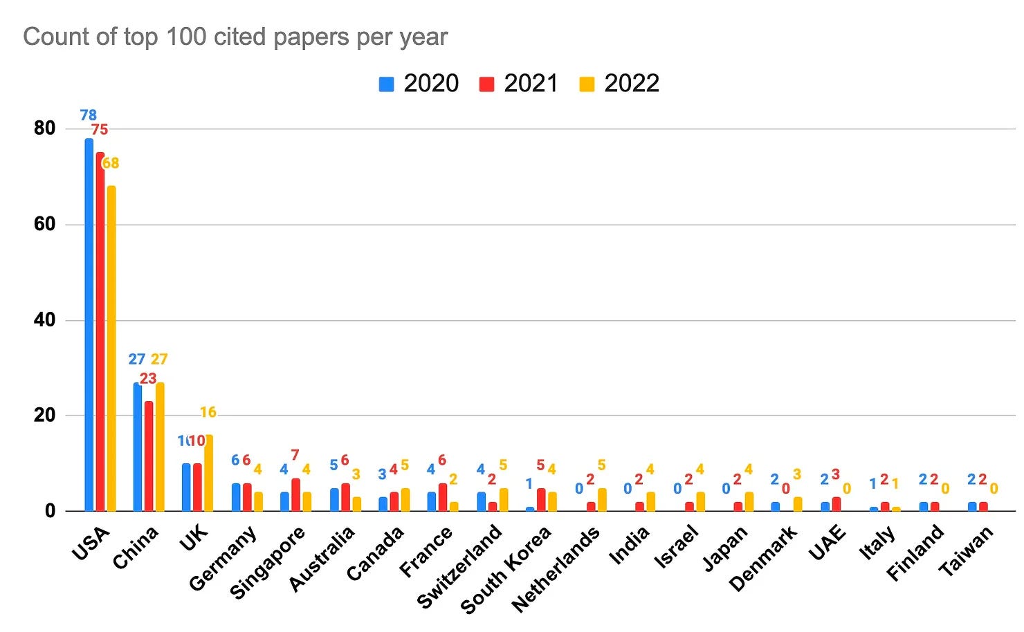 This is, of course, not inevitable. Deepmind is based in London and has produced the most cited AI papers for the past two years. Nevertheless, as the chart below shows, outside of China the great bulk of cited papers on AI have been from the United States.