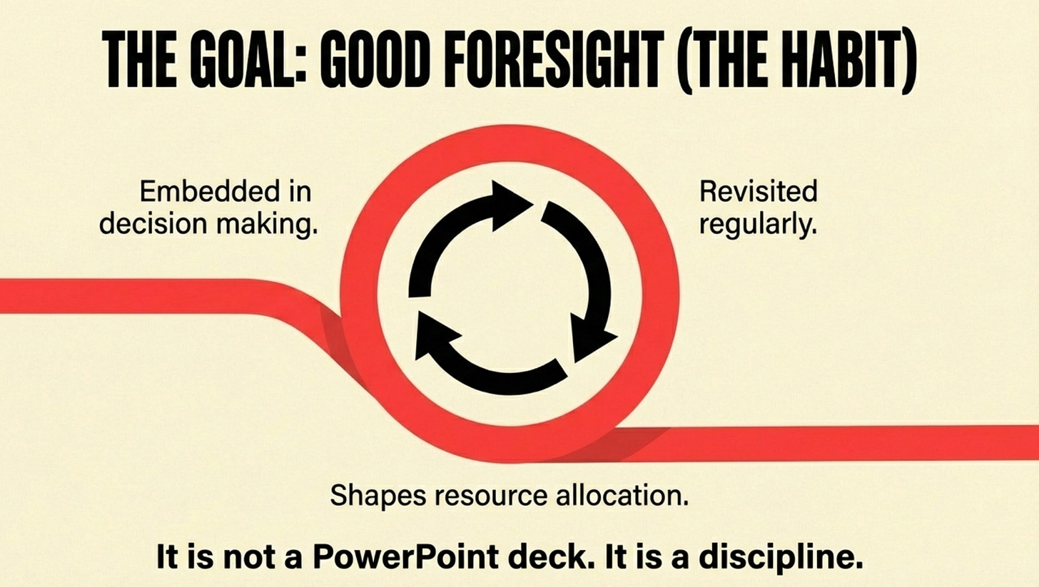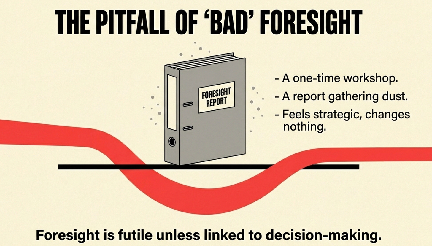 Bad foresight is an interesting workshop that produces a report left gathering dust. It’s a one-time exercise that feels strategic but changes nothing.