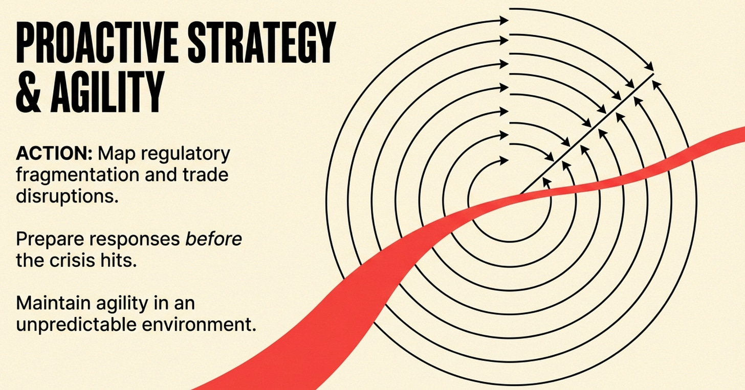 Effective teams use foresight to map multiple possible futures and stress-test their strategies against each. They build scenarios for regulatory fragmentation, trade disruption, and political volatility, then prepare responses before the crisis hits. This is what augmented foresight looks like in practice: AI-powered analysis combined with strategic judgment to maintain agility in an unpredictable environment.