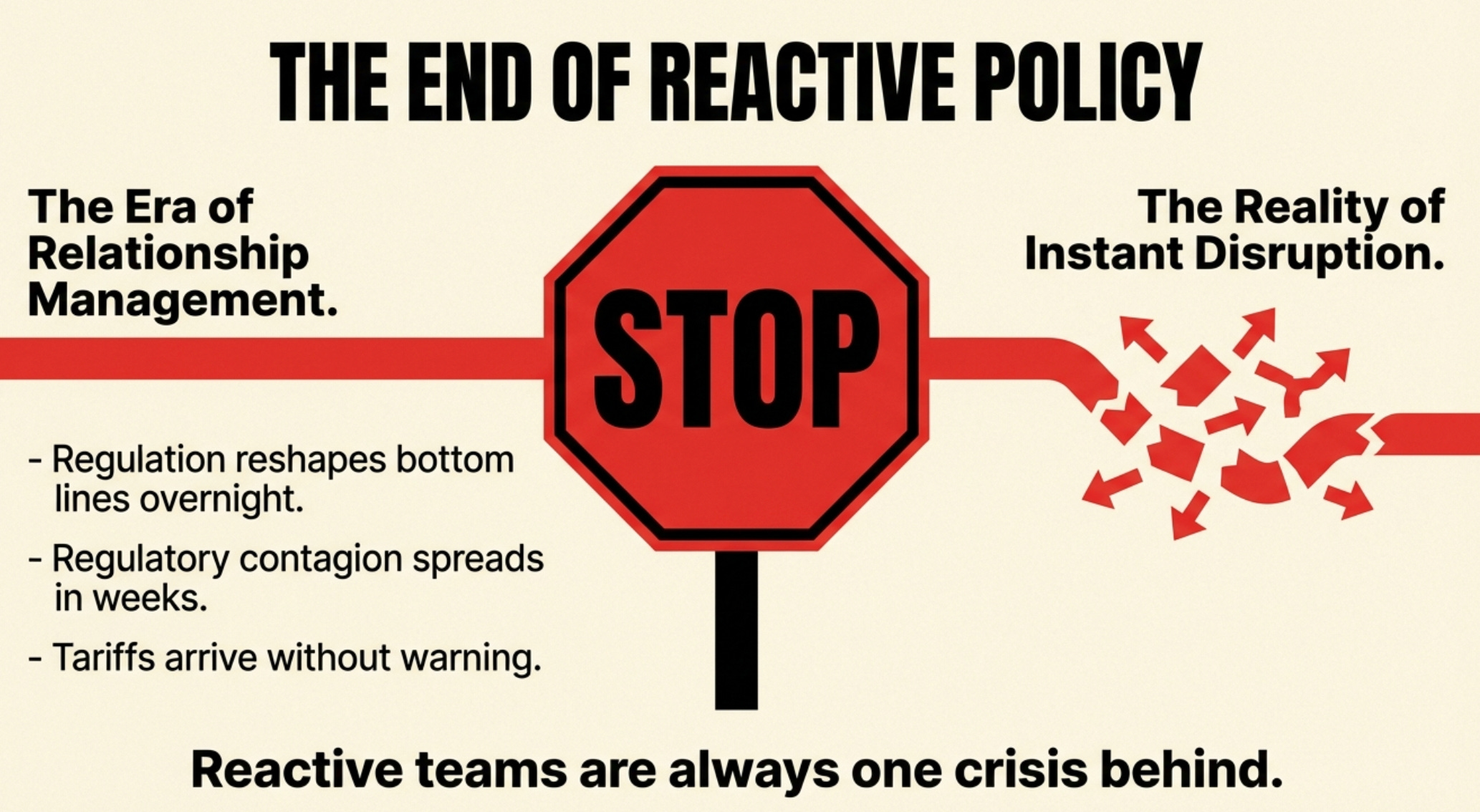 Today’s policy environment moves too fast for that model. Regulation can reshape bottom lines overnight. Regulatory contagion spreads across jurisdictions within weeks. Tariffs, trade restrictions, and geopolitical shocks arrive without warning. Public policy teams that operate reactively will always be one crisis behind.