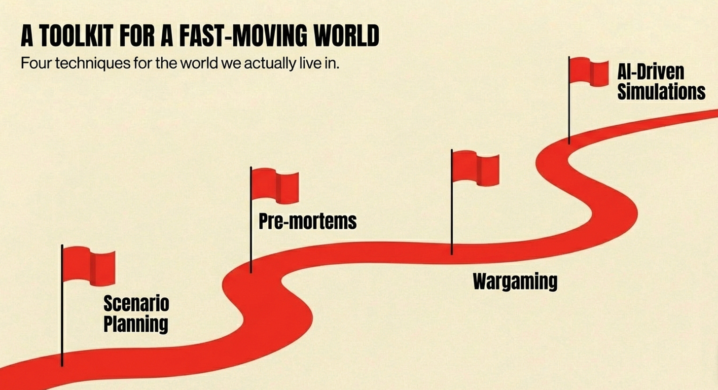 Scenario planning - Build multiple plausible futures and stress-test your decisions against each, rather than betting everything on one forecast;